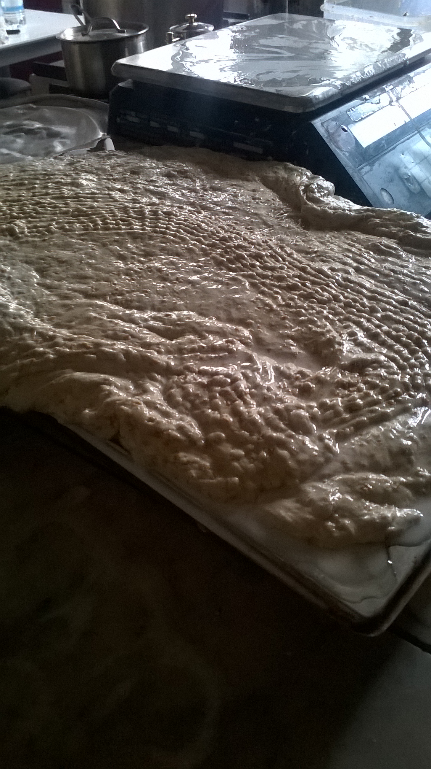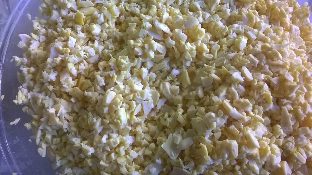 Teresina per il suo tempeh utilizza soia gialla, biologica, non geneticamente modificata (proveniente dall’azienda Lesca di Langosco PV) pulita da eventuali resti di baccello o altre parti della pianta, decorticata con molta pazienza con l’aiuto di un mulino a mano, infine messa a bagno una notte. In seguito si bolle in acqua e aceto di mele per un’ora, e dopo averla asciugata viene inoculata con i fermenti Ryzophus Oligosphorus e Ryzophus Oryzae (provenienti da Top Cultures di Zoersel, in Belgio* o da Indopal di Jakarta, in Indonesia**). A questo punto si procede a mettere la soia dentro dei sacchettini da frigo forati per le verdure. Una volta che sono ben chiusi e appiattiti, si ripongono all’interno di una camera termostatata (auto-costruita da Teresina) dove avviene la fermentazione a temperatura costante di 30°C per 24/32 ore.